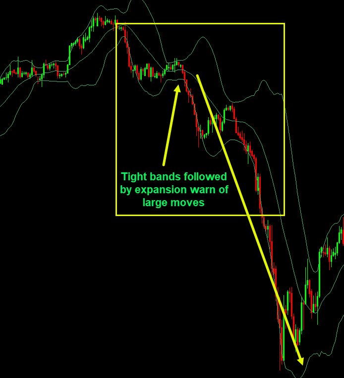 - Tight bands followed by expansion warn of large moves