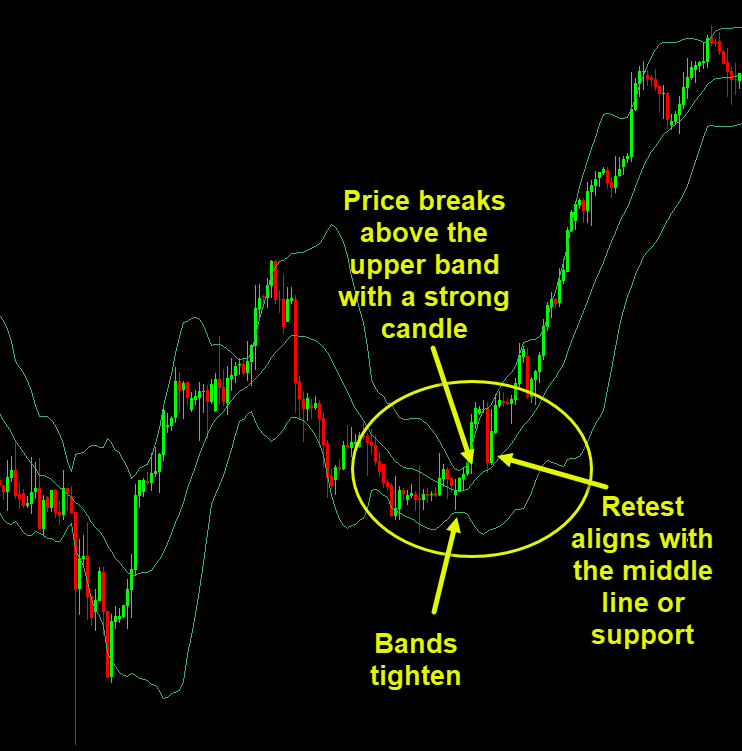 - Price breaks above the upper band with a strong candle