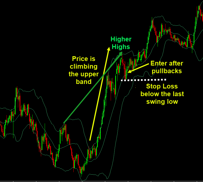 If price is climbing the upper band and forming higher highs, the trend is likely strong. Enter after pullback and place the stop loss below the last swing low.