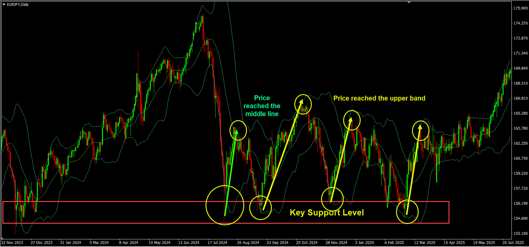 In the below example you can see that the price reached a key support level and whenever the price reaches the lower band it moves higher towards the middle line or to the upper band.