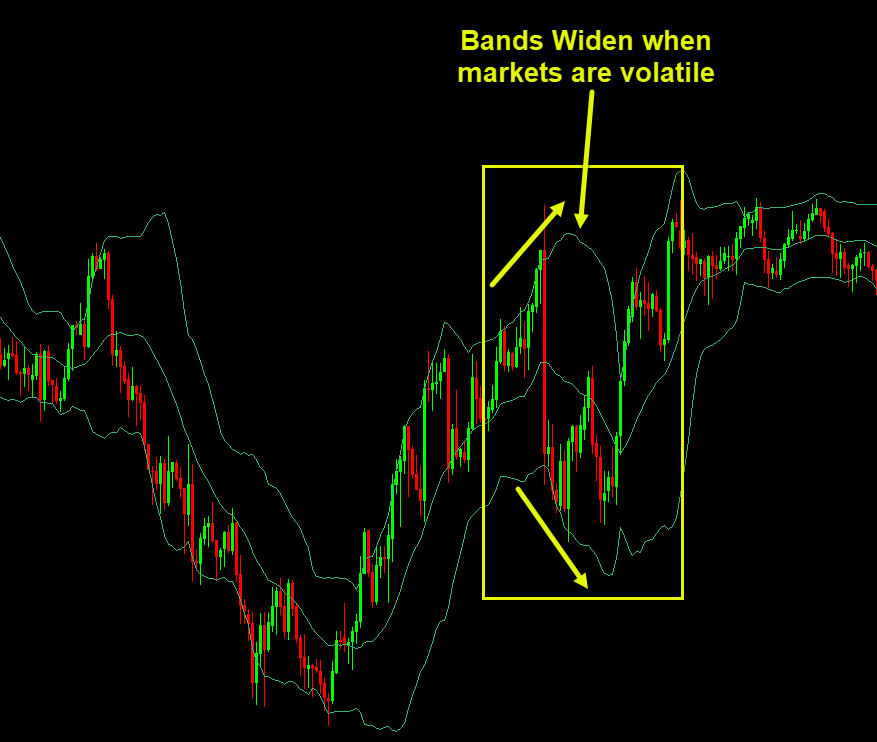 - When markets are volatile → the bands widen