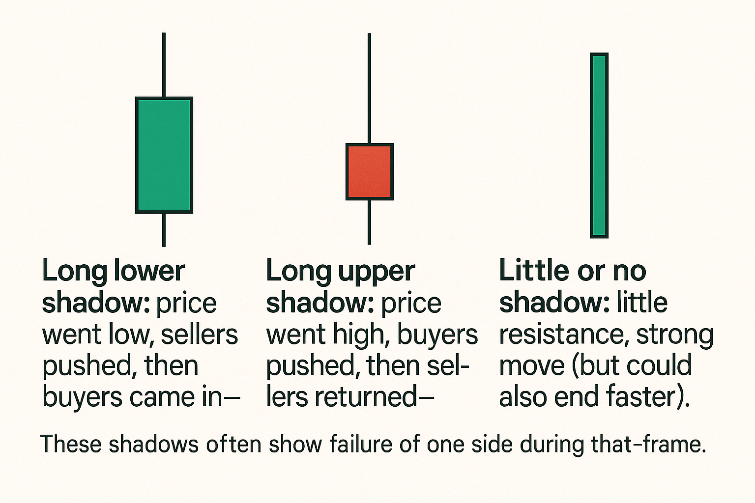 - Long lower shadow: price went low, sellers pushed, then buyers came in—possible rejection of lower prices.