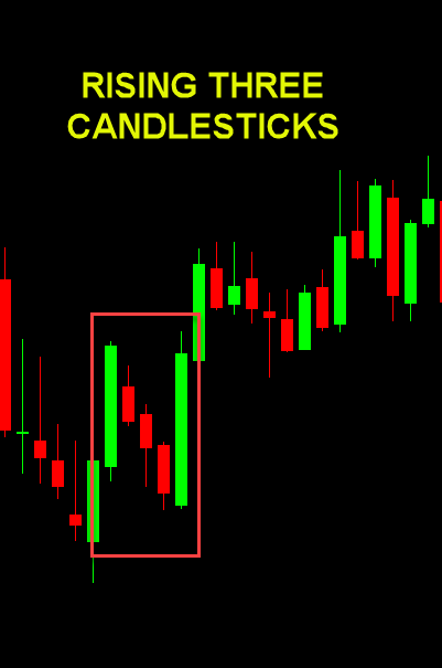 - Rising Three Methods: In an uptrend: Long bullish candle, followed by 3 (or more) smaller bearish but contained candles, then another long bullish candle. Indicates buyers are in control.