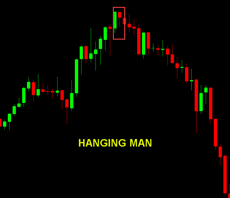 - Hanging Man: Appears after an up-move. Same shape, but here it signals possible exhaustion of the uptrend. Looks like a hammer, but red, and at the end of an uptrend.