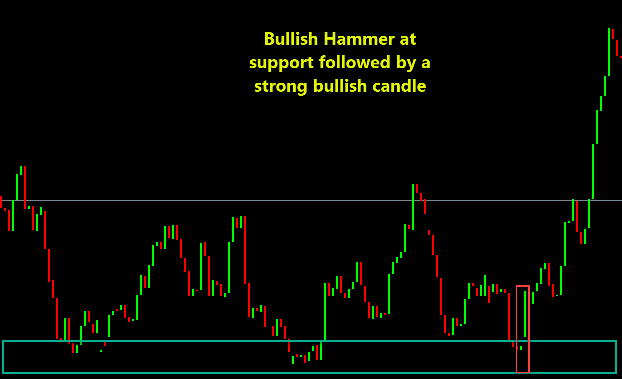 - Reversal trade: GBP/USD you spot a hammer at a strong support level, the next candle closes bullish, you go long.