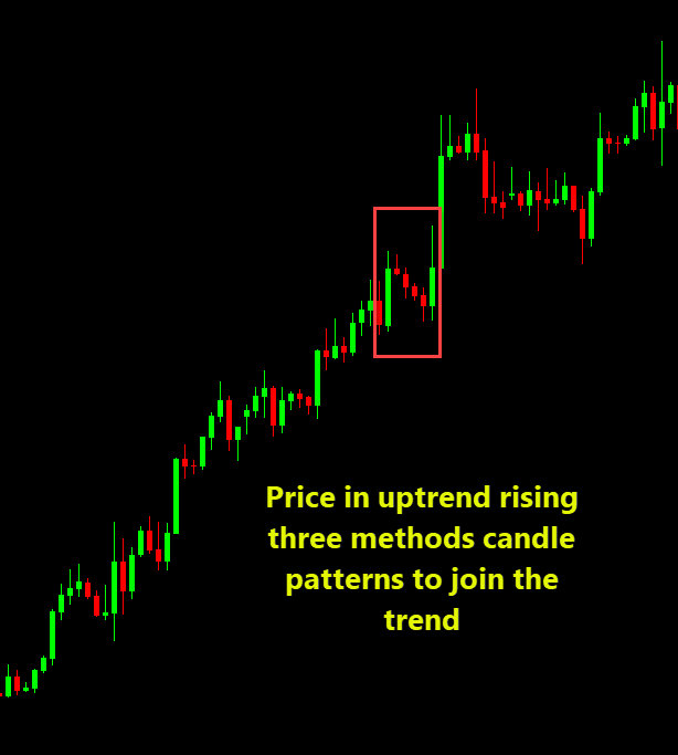 Forex application: If USD/JPY is trending up and you spot a “rising three methods” on H4 or daily, that gives you confidence the trend is intact, and you might add to longs or hold existing ones.