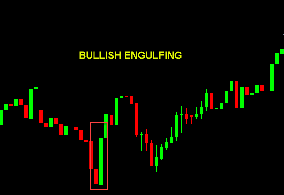 - Bullish Engulfing: A bullish engulfing pattern shows up in a downtrend when a small red candle is followed by a larger green candle that completely covers the prior body. It signals that buyers have stepped in with strength and may be taking control. Many times, the engulfing will cover more than just one of the previous candles.