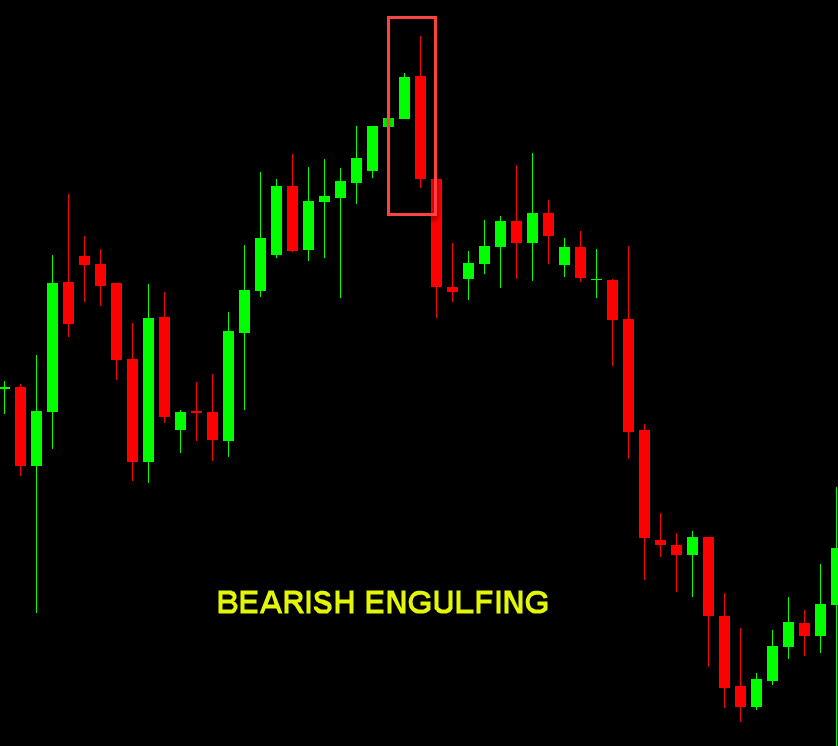 - Bearish Engulfing: During an uptrend, a small bullish candle then a large bearish one engulfing it – shift to sellers.