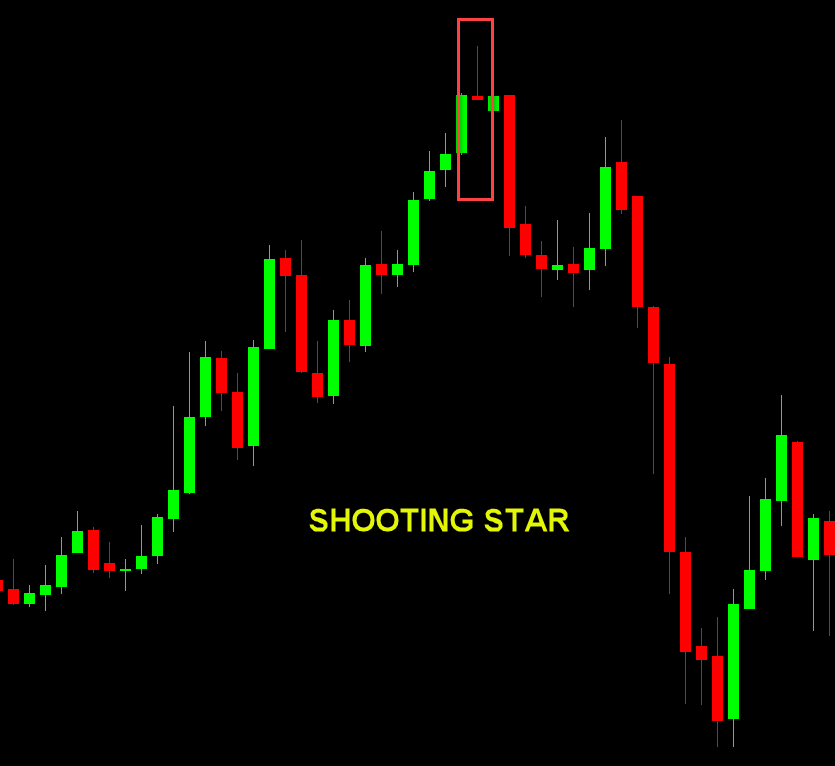 - Shooting Star: After an uptrend — long upper wick, small body at top.