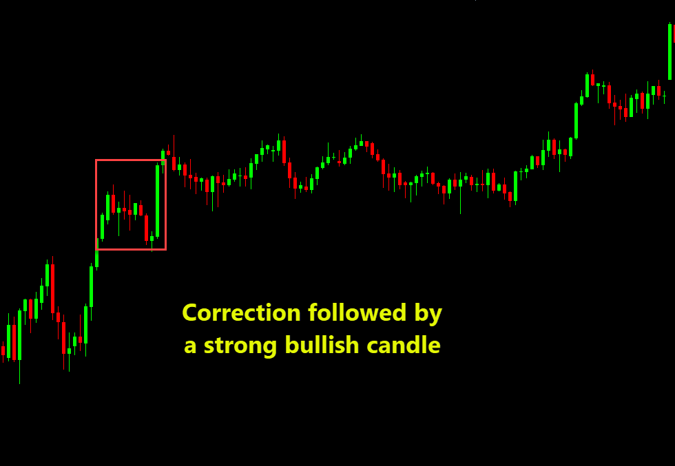 Sometimes the simplest signal: in trend, price pulls back or consolidates, then a strong candle in the trend direction appears — that is a continuation cue. The candlestick isn’t named “pattern” but the logic is the same.