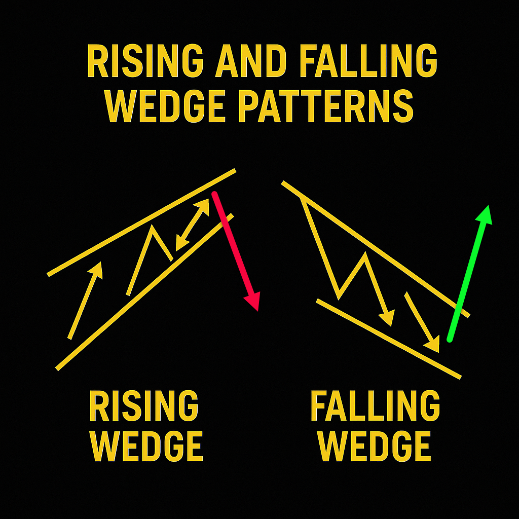 • Falling Wedge: The opposite: two downward-sloping lines, the lower line falling more slowly than the upper, so the wedge narrows on the downside.