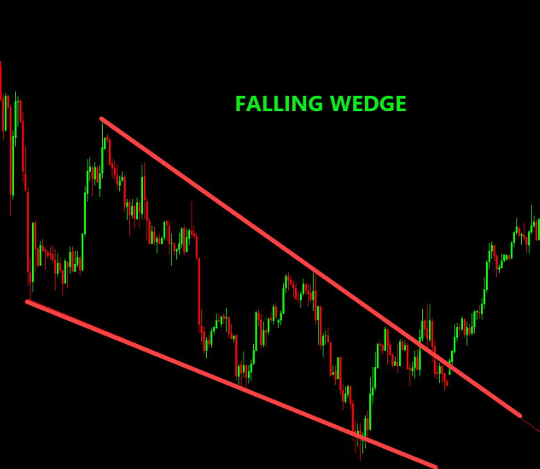 • In a falling wedge, sellers push the price down, but momentum is fading — the lower lows are at a slower pace.