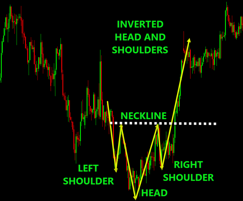 • In a downtrend, the mirror image is the Inverse Head & Shoulders: left shoulder (low), head (lower low), right shoulder (low roughly like first), neckline above, break of neckline signals reversal down → up.