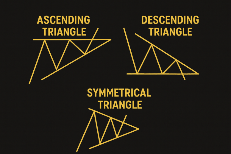 Triangles are among the most reliable and visible continuation or reversal patterns in Forex. There are three main types: Ascending, Descending, and Symmetrical.