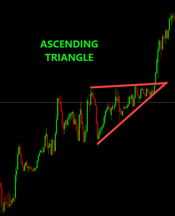 • Ascending Triangle: A flat or almost flat (horizontal) resistance line on top + rising support trendline underneath. Buyers push higher lows, sellers stand at the same resistance level.