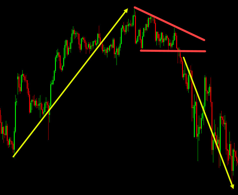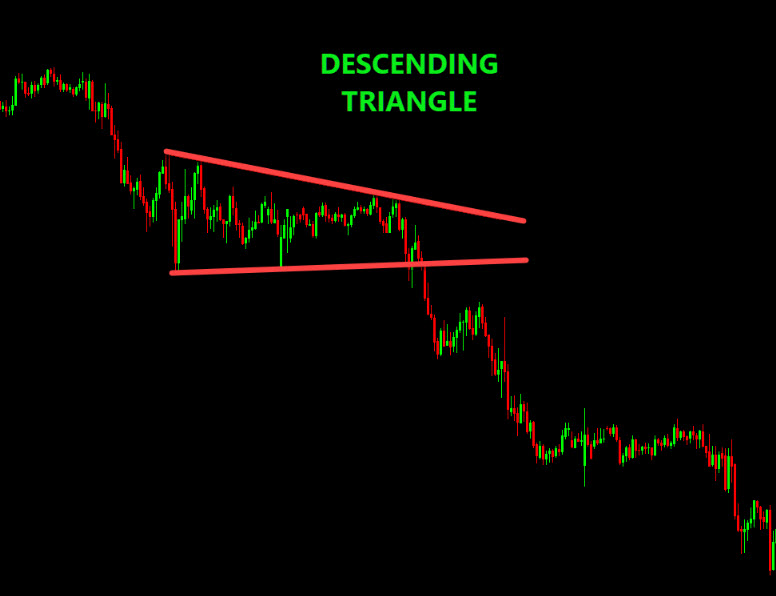 • Descending Triangle: A flat (horizontal) support line on the bottom + descending resistance trendline above. Sellers push lower highs, and buyers stand at a constant support.