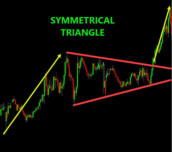 • Symmetrical Triangle: Two converging trendlines (one downward from above, one upward from below). Price compresses into the narrow tip.