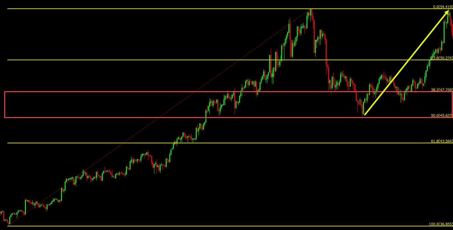 In a strong trend, price often retraces to a Fibonacci level before resuming.