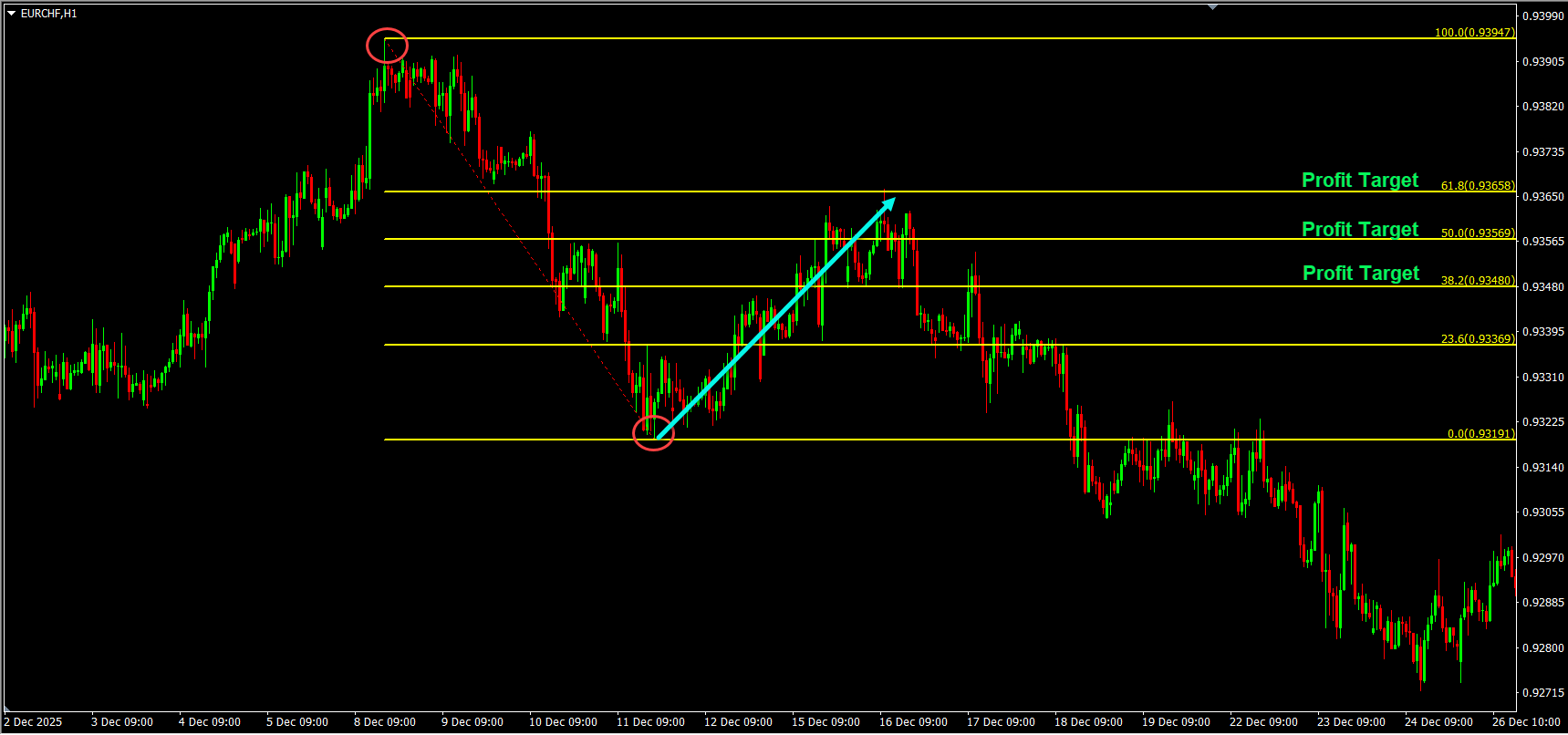 Instead of guessing profit levels, Fibonacci retracement levels can be used to identify realistic and structured profit targets. After a strong bearish or bullish move, traders plot the Fibonacci retracement and look to trade the pullback and often project profit targets toward the key retracement level, such as 38.2%, 50%, or 61.8%.