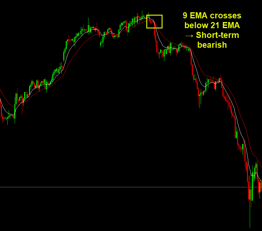 - 9 EMA crosses below 21 EMA → Short-term bearish
