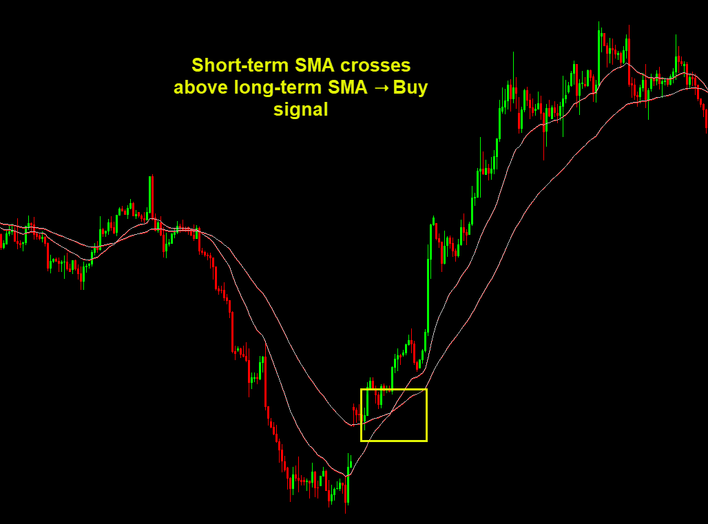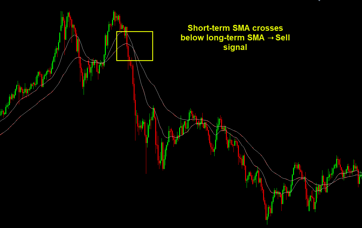 - Short-term SMA (for example, 20) crosses below long-term SMA (for example, 50) ➝ Sell signal