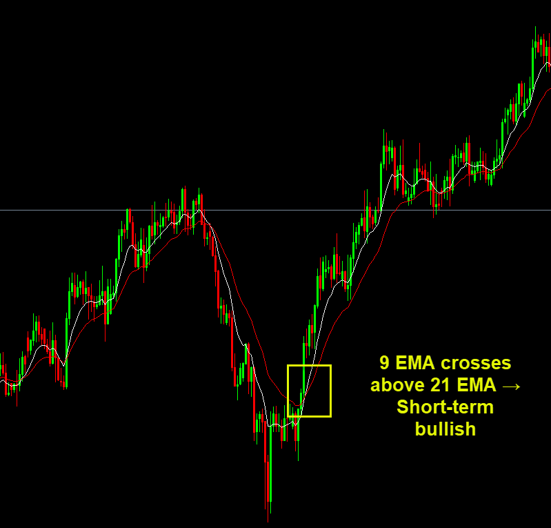 - 9 EMA crosses above 21 EMA → Short-term bullish