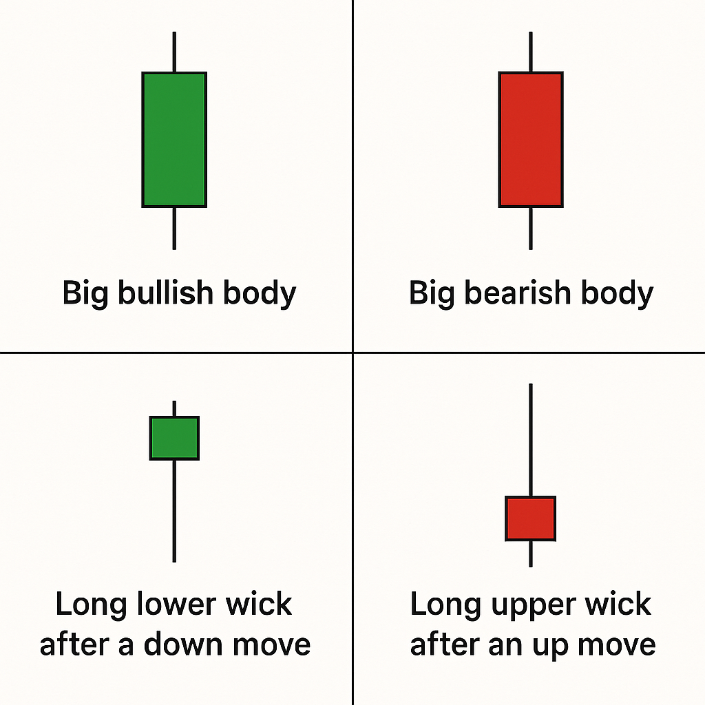 - A large body means strong momentum: buyers were clearly in control (for a bullish candle) or sellers (for bearish).